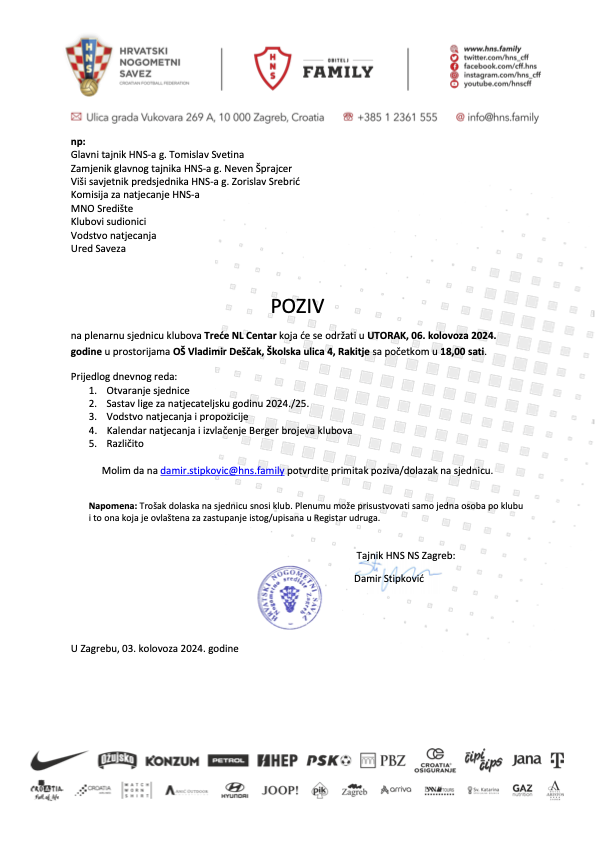 Jučer je održana plenarna sjednica 3.NL Centar, a na kojoj se nije znalo tko je 16. sudionik lige zbog nevjerojatnog pokušaja putem "fuzije" koja se nije dogodila lansirati NK Inker Zaprešić u ligu umjesto upražnjenog mjesta NK Lukavec koji je odustao od natjecanja. Predstavnicima klubova objašnjeno je da će danas u HNS-u biti donesena odluka koji je to od klubova, NK Sava Strmec ili NK Inker Zaprešić, pa se s takvim objašnjenjem odradile točke dnevnog reda, izvlačenja brojeva i određivanja prema Bergeru rasporeda natjecanja u sezoni 2024/25.